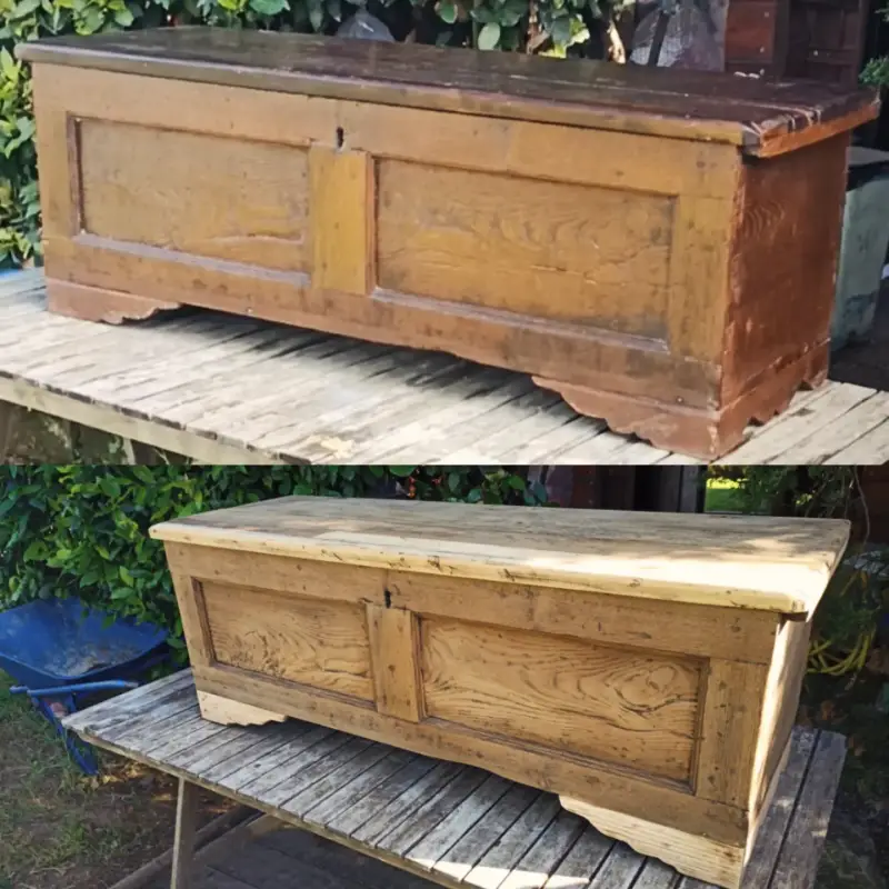 Bellissimo baule, molto antico composto da un mix di legno tra cui castagno e abete. Nel corso degli anni sono state sostituite alcune parti danneggiate dall'usura e dalle termiti. Non è mai facile andare ad operare su oggetti come questi coperti da mani e mani di coppale che poi quando viene tolto di legno non rimane quasi niente. Una volta riportato a legno e sostituito qualche parte "marcia" è stato molto bello vedere il colore naturale del legno messo in risalto dalle venature riaffiorate.